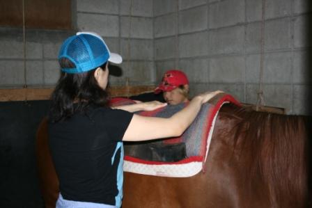 下の写真は鞍を付けている所です。
